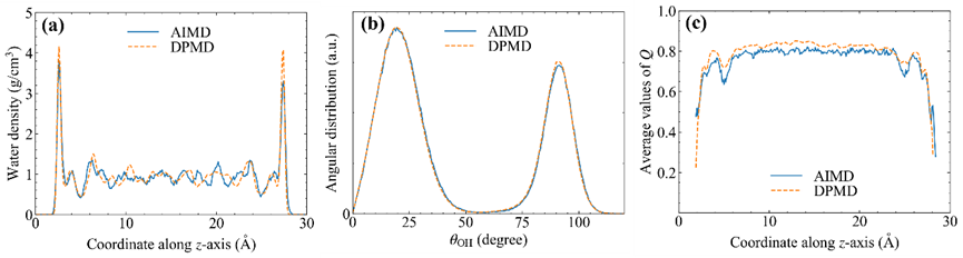 图2对比了基于从头算分子动力学模拟(AIMD)和机器学习加速的分子动力学模拟(DPMD)得到的轨迹结构,用于验证训练的DP模型的可靠性。结果表明AIMD和DPMD能够给出基本一样的结构信息。
