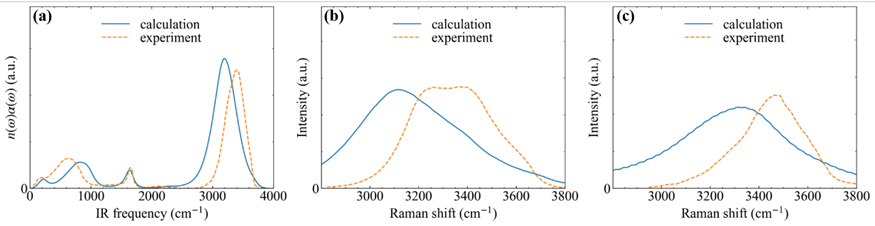 图3对比了基于DW模型计算得到的体相水的红外拉曼光谱和实验光谱,用于验证DW模型的可靠性。由于计算采用的PBE泛函给出的振动频率偏低,导致计算和实验光谱的振动频率有一定差距,但对应的光谱特征能够相互对应。