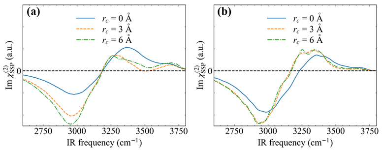 图4研究了基于偶极矩-极化率关联函数(μ-α)和表面敏感速度-速度关联函数(ssVVCF)两种方法计算 SFG 光谱的差异。结果表明,使用μ-α方法计算α-Al2O3(0001)-水界面的SFG光谱时,计算互关联项时需要考虑较大的截断半径。这是由于表面羟基和界面第一层水之间的相互作用对 SFG 光谱产生了显著影响。这种影响有别于不同截断半径对空气-水界面和疏水界面的 SFG 光谱的影响。