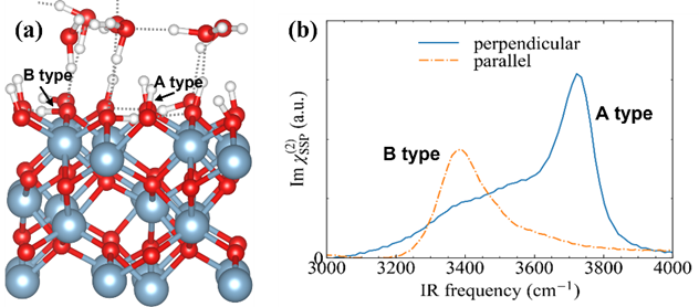 图5展示了两种不同类型的界面羟基和对应的SFG光谱,表明α-Al2O3(0001)表面存在着直立和水平的羟基,对应的振动频率也存在明显差异。直立羟基(A type)由于不能形成氢键有着较高的振动频率,而水平羟基(B type)由于和周围羟基的氧形成氢键振动频率较低。