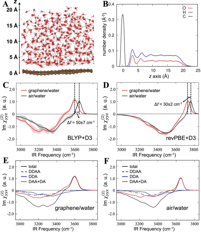 本工作的创新点在于两部分:1)实验部分利用将外延生长的石墨烯转移到液态水的表面,构造了悬浮石墨烯与水的直接接触的界面,从而避免了以前实验中遇到的来自石墨烯衬底的信号干扰,为研究石墨烯与水的相互作用创造了条件。通过HD-SFG光谱测量,可以直接对比自由氢氧基团与参与氢键基团的光谱响应强度,为对比纯水与空气界面创造了条件;2)理论计算部分,通过课题组发展的基于人工智能加速势函数分子动力学模拟石墨烯与水界面,在此基础上利用前期发展的高精度和频光谱算法获得了能够与实验定量吻合的理论光谱。再结合理论分析工具,表明自由氢氧基团的特征峰频率轻微降低是由于石墨烯表面与水之间的范德华作用及氢原子与石墨烯的π-轨道相互作用。石墨烯对水分子结构的影响非常有限,对顶层水分子的影响主要体现为微小的频率变化。充分展示了理论与实验结合研究此类问题的威力。