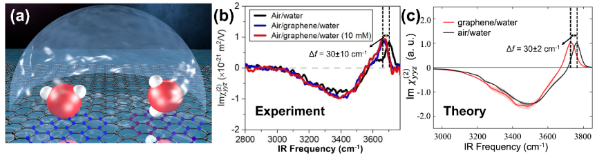 石墨烯与水及水性电解质接触的界面在许多技术应用中都极为重要,这些应用包括海水淡化、能源存储与转换、化学感测、生物感测以及电催化等领域。理解石墨烯如何影响水分子的结构,例如其取向和氢键网络,如图1 (a)所示,是掌握这些系统工作机制的关键。这种被介质包围的界面通常难以用常规实验手段探测,其界面信号经常被体相的信号所掩盖,因此难以进行解析。对于这类界面,一种常用的探测技术是和频光谱(HD-SFG)。目前,来自不同实验和理论团队对石墨烯-水界面相互作用的理解存在争议,关键争论点在于石墨烯是否会调制与其接触的水的微观结构。
