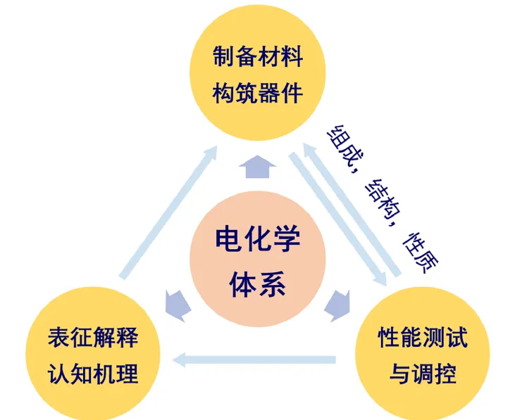 面向能源需求的电化学技术和产业需用全链条的视野关注原料、材料、器件、应用四个层次的问题。“料-材-器-用”四个层次及其关联环节都与测试紧密相关。通常需要对原料、材料和器件进行纯度、缺陷、性能等的全方位表征分析。有些研究仅从材料的角度来考虑问题,基于新材料构建器件后,直接进行性能测试,若性能不佳,则返回改变和调整材料组成和结构,并再次组装器件测试性能。如此“制备材料/构筑器件-性能测试与调控”二元往复的研究方法看似简单,但试错模式导致时间、人力和物力成本巨大,更难以高效实现高性能目标和可持续创新发展。因此,在二元为主的体系中加入表征/机理的环节,进而形成如图1所示“制备材料/构筑器件-性能测试与调控-表征解释/认知机理”三元循环而实现高效的螺旋式提升,这对于系统研究前所未有复杂的能源电化学体系是非常必要的。而在表征环节中,相比较于各类材料的本体和本征物性表征,各种微观和动态界面表征是重中之重。