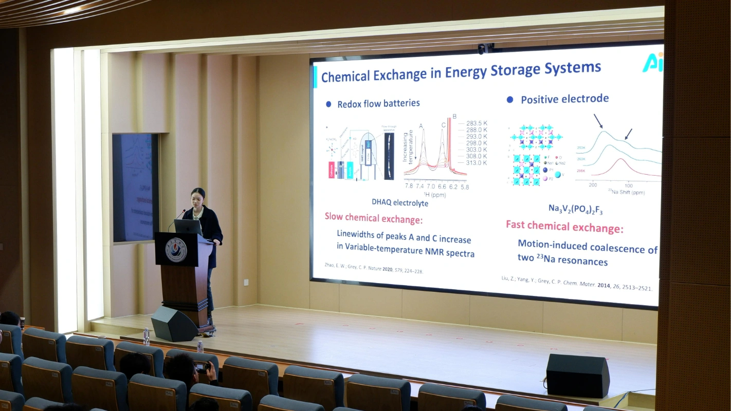 厦门大学尤祺同学从核磁共振谱的基本原理出发,介绍了机器学习驱动的动态核磁共振谱计算方法及其在电池正极材料、电解液等电化学复杂体系中的应用,并揭示了谱学信号与材料微观结构之间的内在联系。