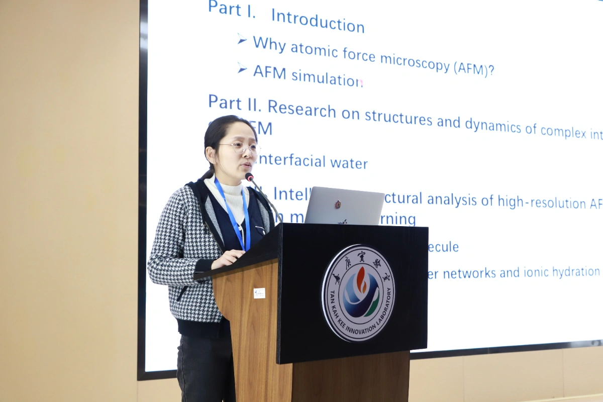 北京理工大学曹端云研究员从原子力显微镜(AFM)的原理和应用背景出发,介绍了频率调整AFM及其模拟的基本优势,结合谐振子模型,探针粒子模型等理论,重点讲解了不同类型的CO针尖在含苯环的有机体系,界面水分子的氢键网络等领域的应用。
